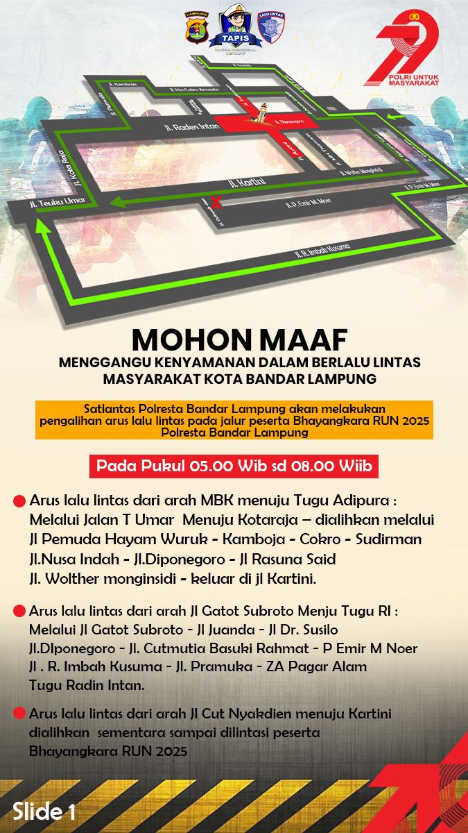 Lampung – Satuan Lalu Lintas (Satlantas) Polresta Bandar Lampung akan melakukan pengalihan arus lalu lintas di sejumlah ruas jalan utama pada Minggu (22/6/2025) pagi dalam rangka mendukung kelancaran kegiatan Bhayangkara Run 2025.