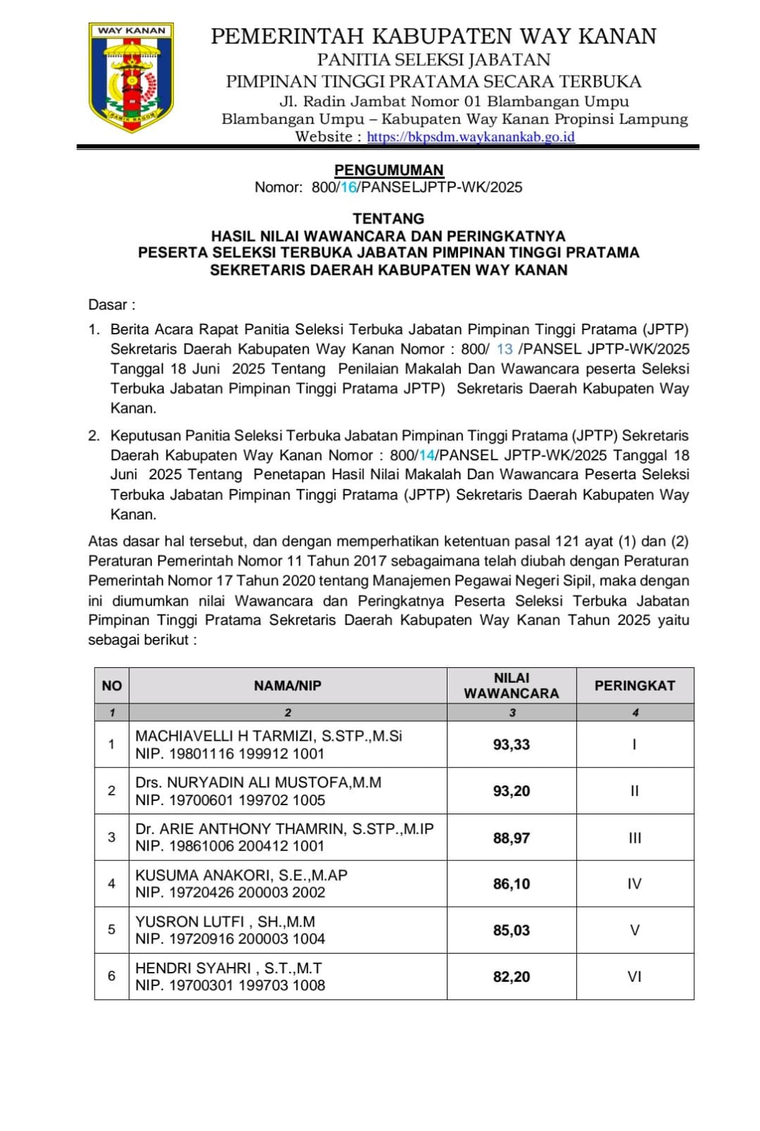 Way Kanan – Hasil wawancara seleksi terbuka Jabatan Pimpinan Tinggi Pratama (JPTP) Sekretaris Daerah Kabupaten Way Kanan tahun 2025 resmi diumumkan. Dari enam peserta yang mengikuti tahapan seleksi wawancara, Machiavelli H Tarmizi, S.STP., M.Si. meraih nilai tertinggi dengan skor 93,33 dan menempati peringkat pertama.