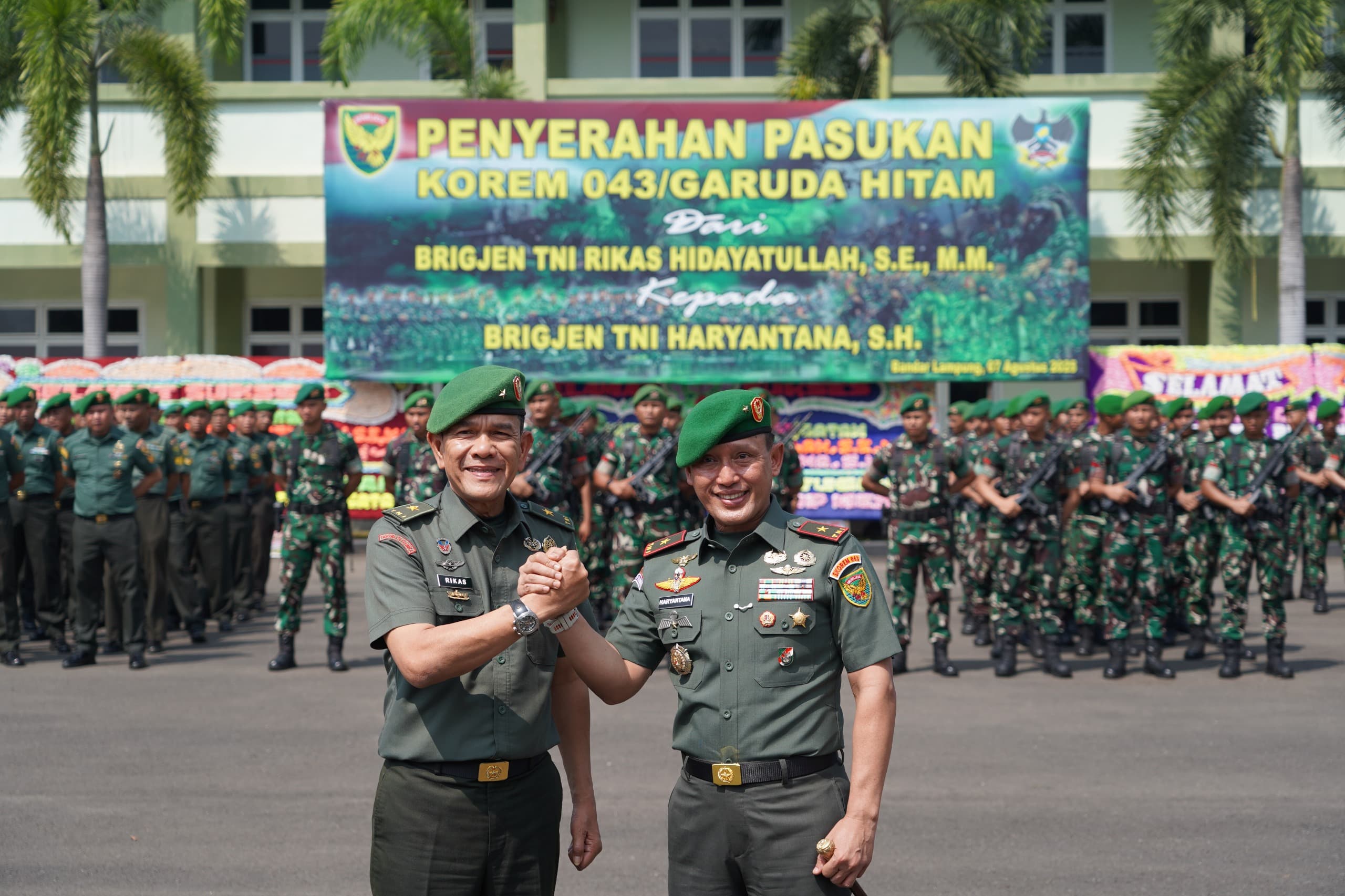 Bandar Lampung – Dalam rangkaian kegiatan Serah Terima Jabatan Komandan Korem 043/Garuda Hitam (Gatam), telah dilaksanakan Apel Penyerahan Pasukan dari pejabat lama Brigjen TNI Rikas Hidayatullah, S.E., M.M. kepada Brigjen TNI Haryantana, S.H. selaku Danrem 043/Gatam yang baru. Kegiatan ini digelar di Lapangan Upacara Makorem 043/Gatam, Jl. Teuku Umar, Penengahan, Bandar Lampung, pada Kamis (7/08/2025).