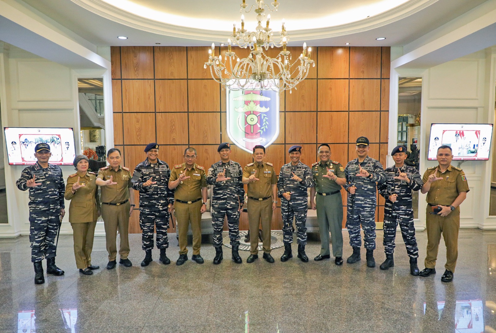 Bandarlampung- Pj. Sekretaris Daerah Provinsi (Sekdaprov) Lampung Muhammad Firsada, menerima kunjungan kehormatan (courtesy call) Komandan Gugus Tempur Laut (Danguspurla) Koarmada I Jakarta Laksamana Pertama Mohamad Taufik, di Ruang Kerja Sekretaris Daerah Provinsi Lampung, Kompleks Kantor Gubernur, Bandarlampung, Senin (24/03/2025).