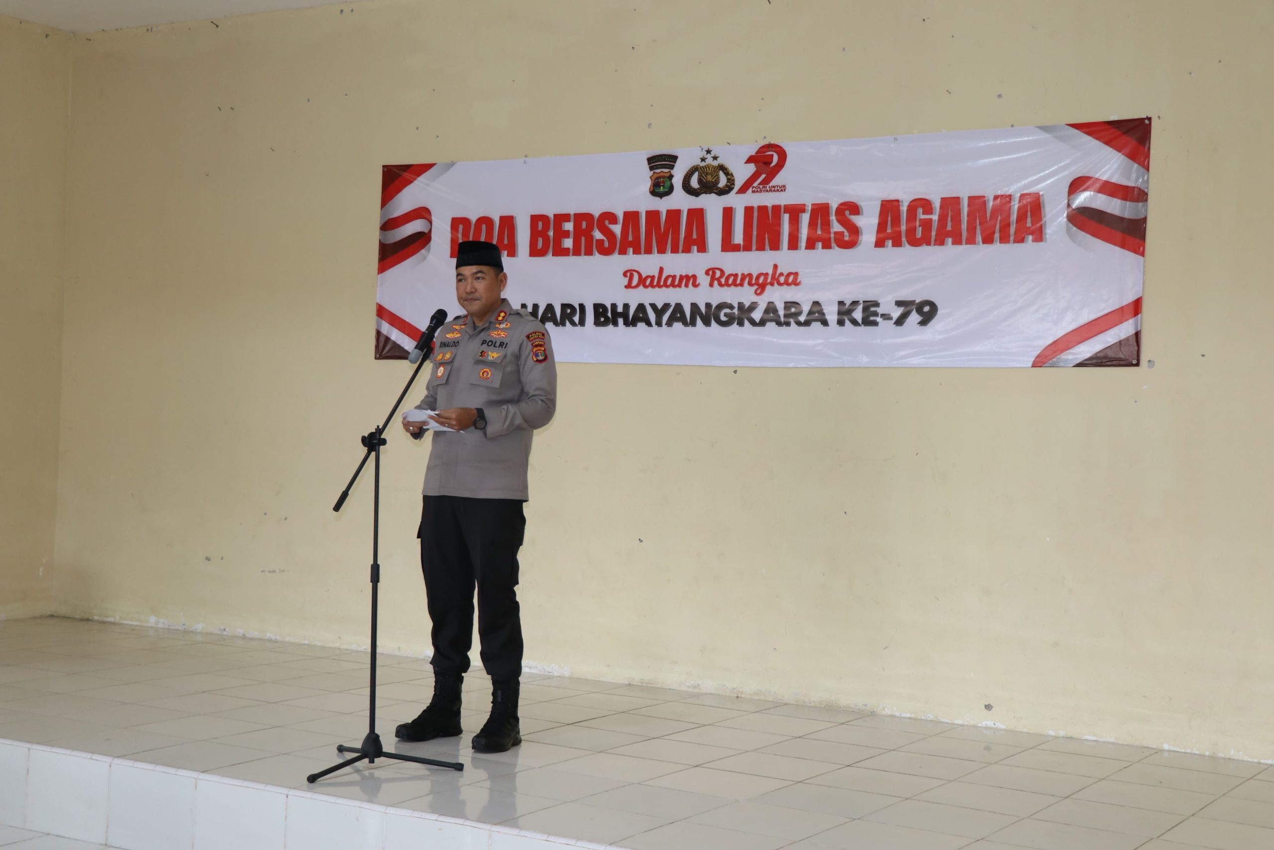 Kegiatan Doa Bersama Lintas Agama dalam Rangka Hari Bhayangkara ke-79 dihadiri oleh para tokoh lintas agama, diantaranya Agama Islam H. Fairozi, Agama Kristen Protestan Pendeta Simanjuntak, Agama Hindu PHDi Ida Bagus Kade Widhi, Agama Budha MBI Romo Hendri Purna Irawan dan Agama Kristen Katolik Romo Yohanes Sugiarto.