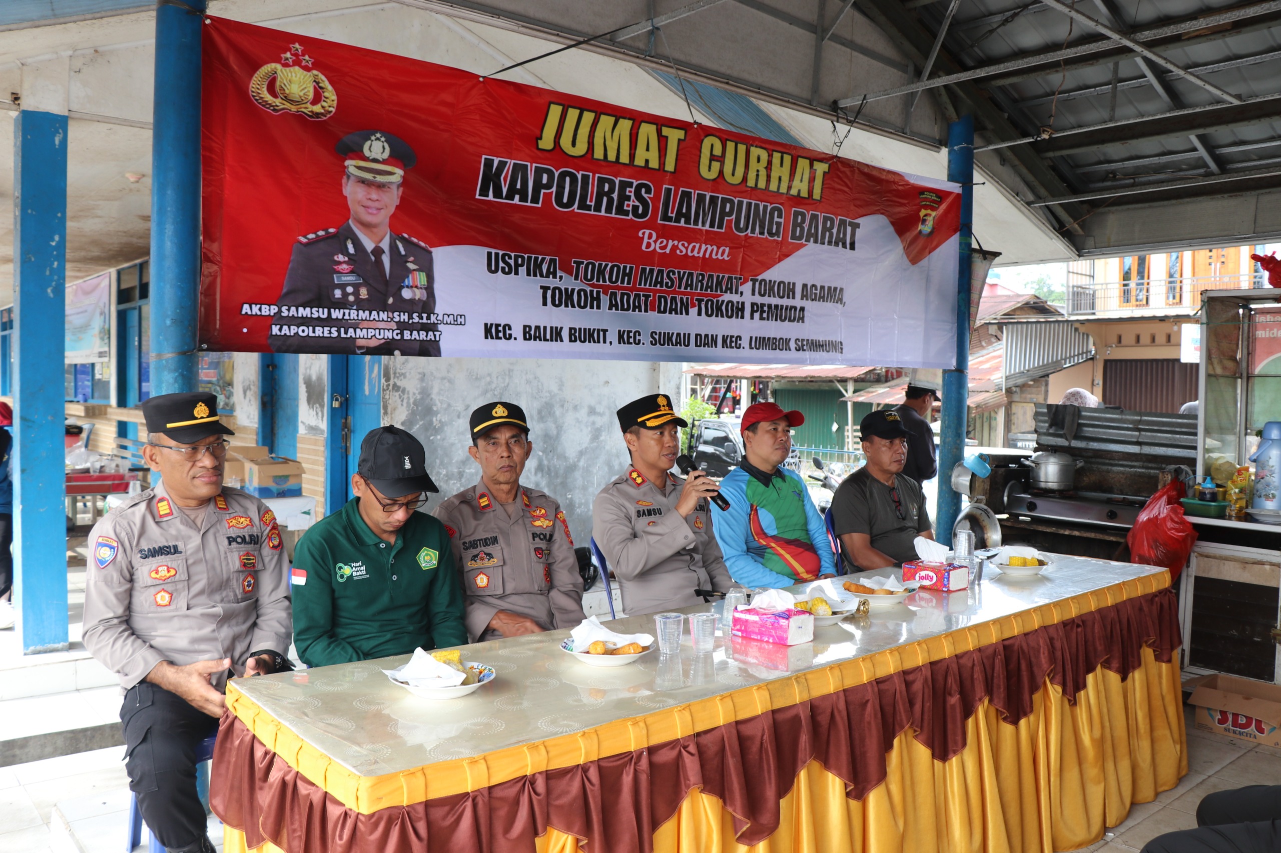 Kapolres Lampung Barat menyampaikan bahwa program Jumat Curhat merupakan wadah bagi masyarakat untuk menyampaikan keluhan, saran, maupun masukan terkait situasi keamanan dan ketertiban masyarakat (kamtibmas) serta pelayanan kepolisian di wilayah hukum Polres Lampung Barat.
